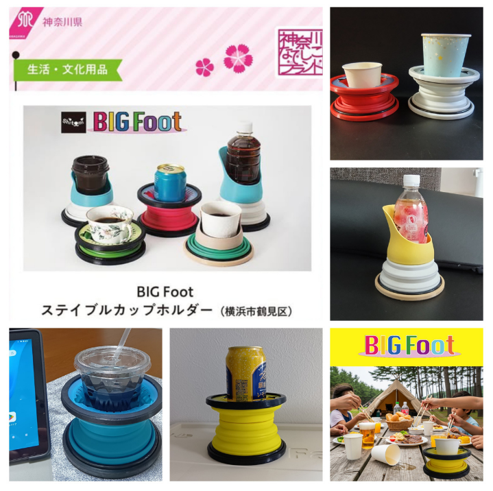 かながわなでしこブランドブースでは、BIG Foot(ビッグフット)カップホルダーを展示販売します。 BIG Footは、転倒を防いで飲み物をしっかりホールドする、安定感のあるカップホルダーです。様々なカラーを取り揃えており、室内はもちろん、アウトドアやキャンプにも最適です。